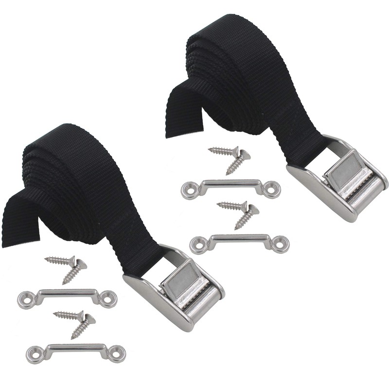- Quantity : 2 Lashing straps - 54 Inches long. 2 cam buckles -stainless steel. 4-Eye strap mounts - stainless steel. 8 SS screws.