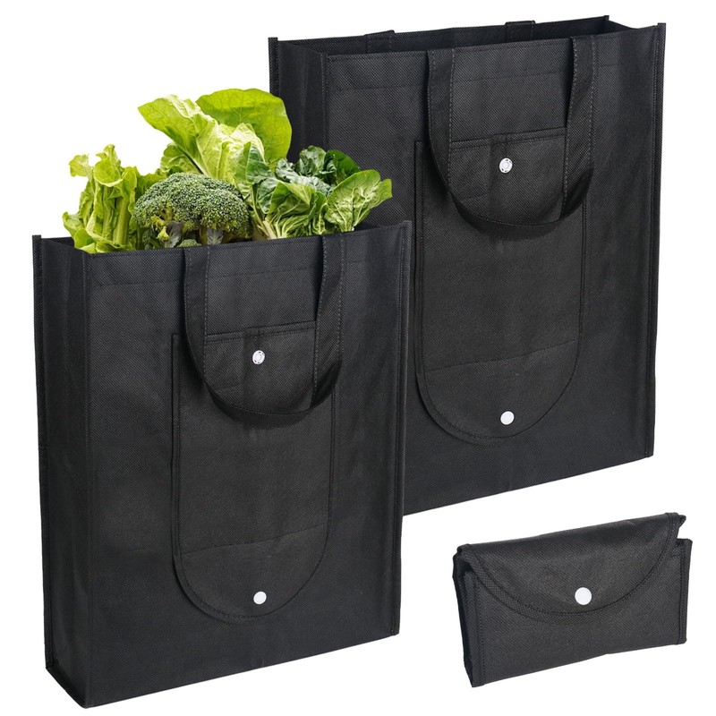 YYTECH Foldable Shopping Bag, Pack of 2, Black Carry Bags with Press Stud and Front Pocket, 38 x 33.5 x 25.5 cm, Reusable Large Shopping Bag for Shopping/Holiday/Picnic, black