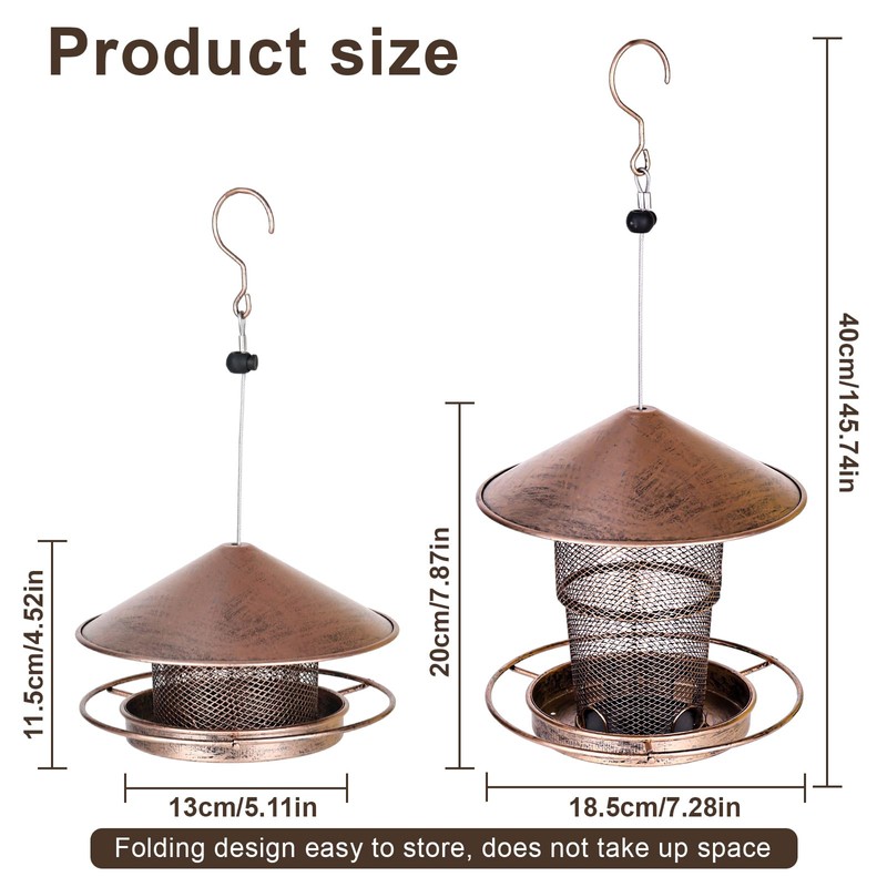 - Weatherproof: This outdoor hanging bird feeder is made of high-quality metal and is sturdy and durable, waterproof and easy to clean, rust and corrosion resistant, suitable for year-round use in any weather. The roof-shaped metal cover on the top of the hanging bird feeder does not effectively prevent rainwater from entering and keeps the birds' food dry and fresh