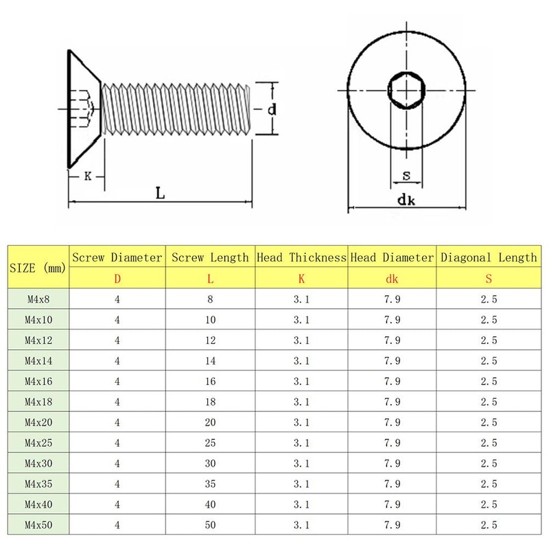Yyyuluo M4 Countersunk Head Screw 304 Stainless Steel Hexagon Socket Machine Screws Grade 8 Flat Head Wood Screws for Woodworking DIY Metal Construction