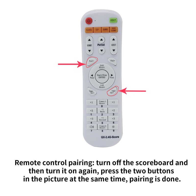 - Press [Foul+](left) and [Timer Out+](right) together to pair with scoreboard