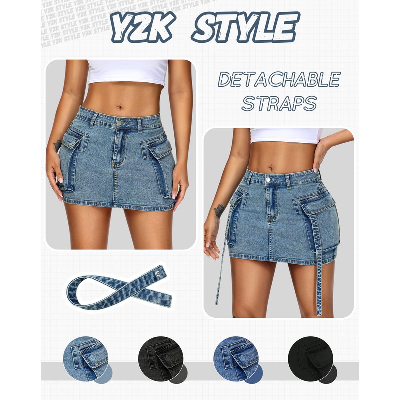 - Design Highlights: Y2k style, detachable side straps, low waist design, mini length, high-stretch fabric, flap pockets, button-zip fly.