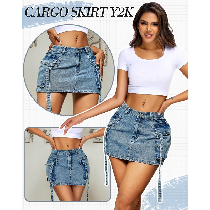 YZEGGO Cargo Skirt Women Y2k Button Jean Skirt Low Waist Denim Mini Skirt with Pocket (Denim Blue_Light Wash, Large)