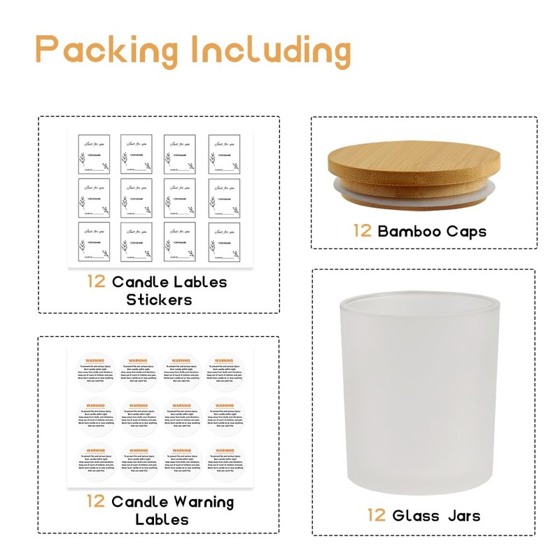 - 【Fashion candle Making Supplies Set】: 12 wide mouth 4/7/10 oz Amber, Clear, Green, Frosted white, Purple, Frosted Powder, matte black, matte white bamboo lid candle jars, 12 scented candle sticker labels and 12 candle warning labels. Suitable for DIY handmade candle supplies.