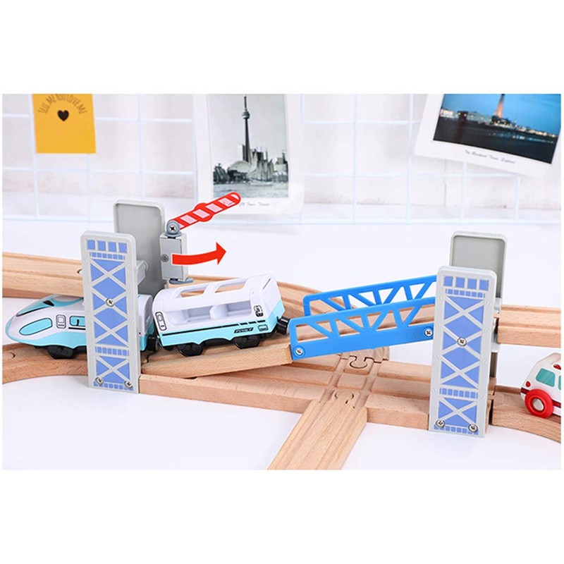 - Wooden train tracks accessories of lifting overpass bridge come with crossing tracks and bridge unit that moved up and down by barriers.