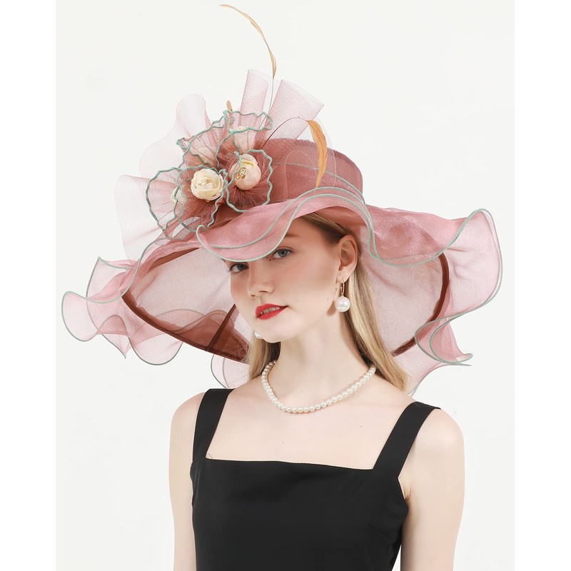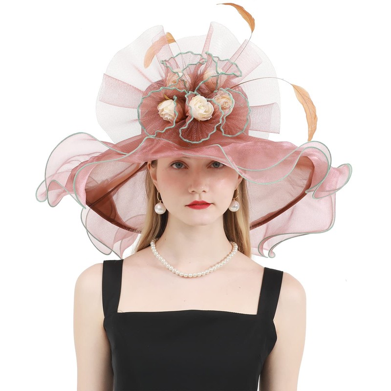 Z&X Women Organza Derby Hat Rose Flower Wedding Tea Party Fascinator Hat Wide Brim Sun Caps Brown Pink