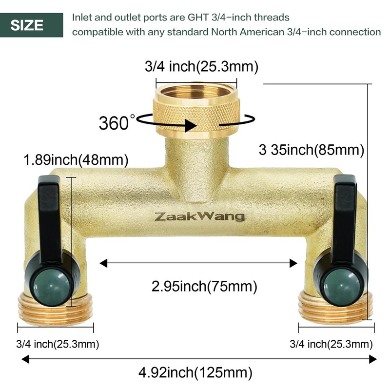 ZaakWang Brass Garden Hose Splitter, 3/4" 2 Way Tap Splitter,Hose Tap Splitter Connection with 2 Individual On/Off Valve and Extended Handle, Hose Pipe Tap Splitter can Mounting Two Timer
