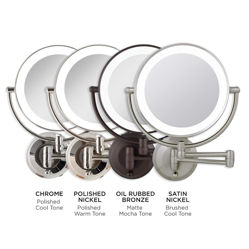 - Cordless LED lighted wall makeup mirror with 10X and 1X magnification. The brightness is is 227.036 lux