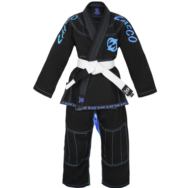 Zafco Sports Brazilian Jiu Jitsu, Kids Jiu Jitsu Gi Children BJJ Gi Grappling Kimonos Lightweight White Belt, Black/Sky-blue, 0