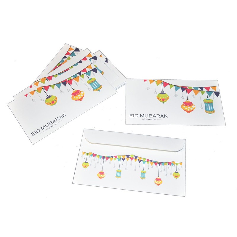 These color Eid gift money envelopes are a great way to give gifts during Eid. The bright design features the message "Eid Mubarak" on the front in our lanterns theme designs, and a colorful matching background design. It is cheerful and will be appreciated by those of all ages. This listing is for one pack of envelopes, which includes 8 separate envelopes. They can be sealed using the adhesive on the back flap. The envelopes are made of smooth high quality paper, full color with a white background; 3.625" by 6.5" in size.