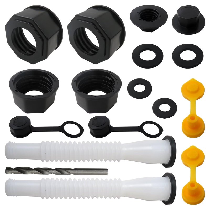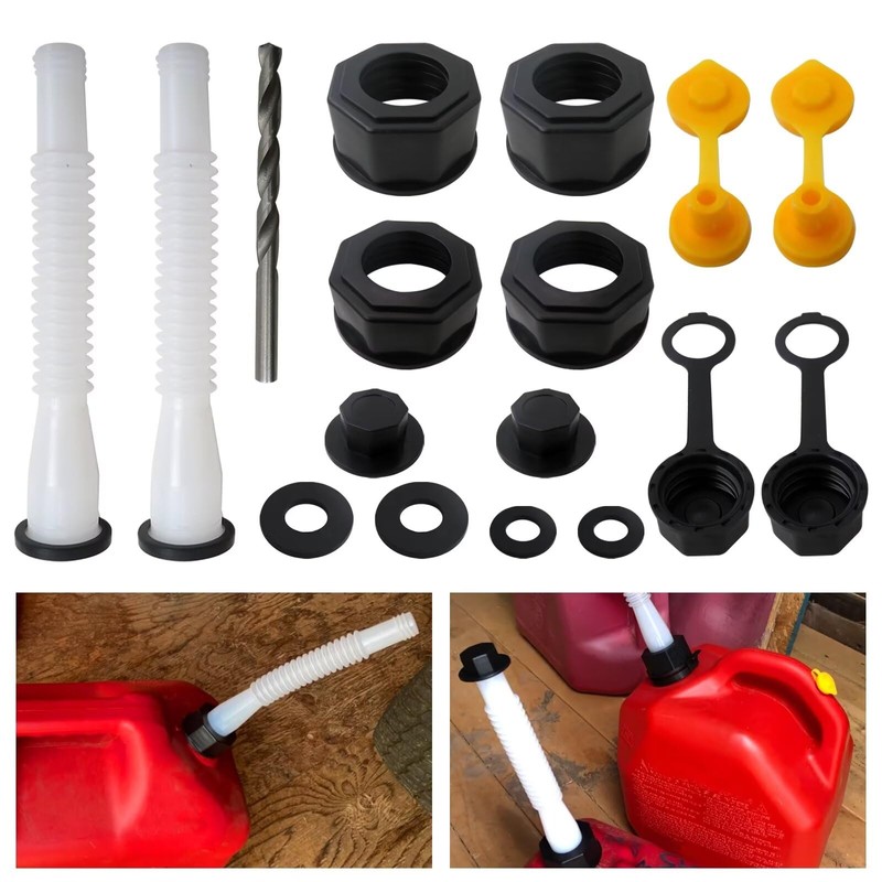 4 Screw Collar Caps (2 Coarse Thread &2 Fine Thread) 2 White Spouts and rubber gaskets, 2 nozzle caps with threads,2 kinds of gas can vent caps