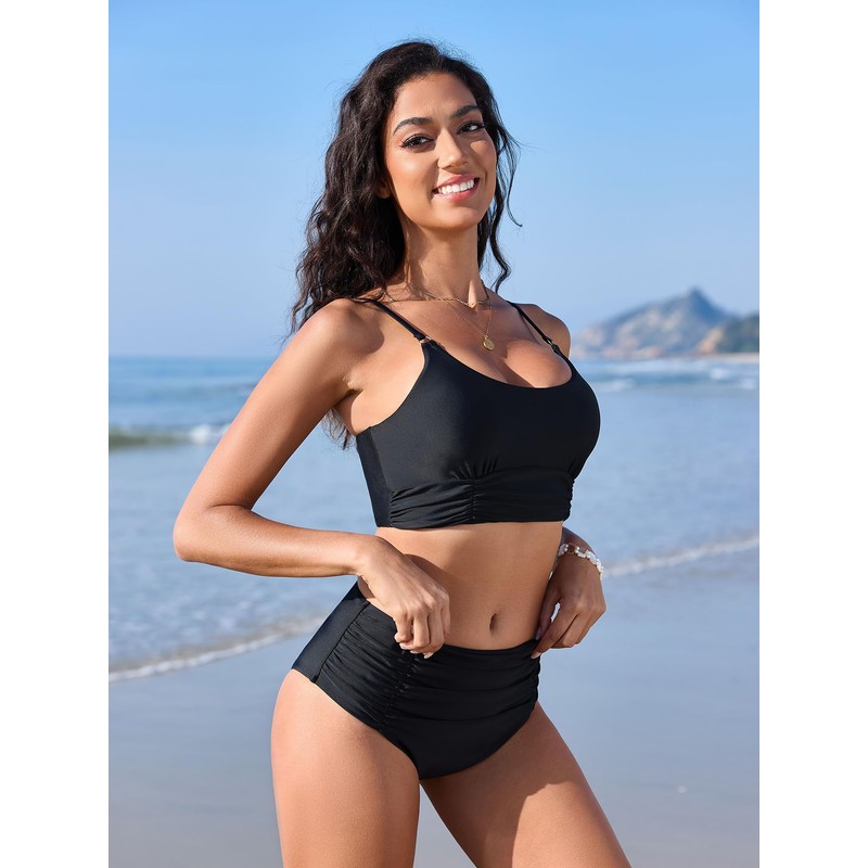 ZAFUL High Waisted Bikini Sets for Women 2 Piece Tummy Control Bathing Suits Sporty Ruched Swimsuits Full Coverage Black
