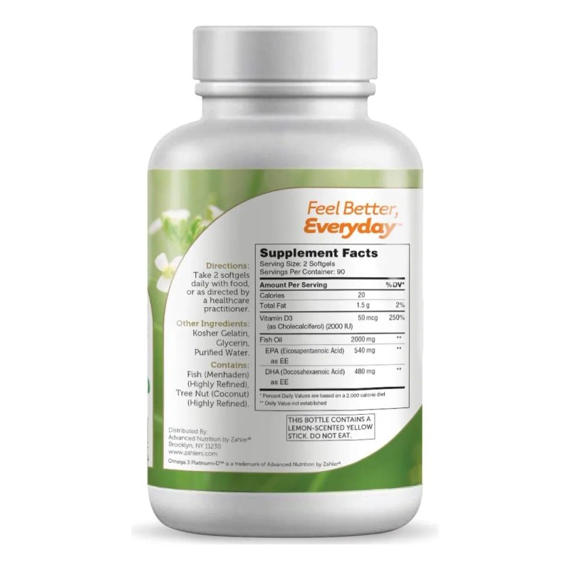Zahler Omega 3 Platinum y Vitamina D3 2000mg 180softgels Sin Sabor