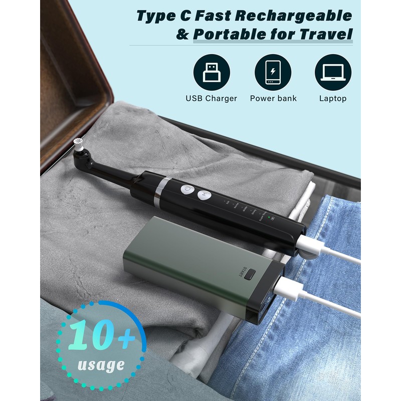 - Type-C Rechargeable for 10+ Times Usage - This professional electric tooth polisher features a built-in 1500mAh large battery that brings 10+ times use from a single 2-hour charge. With a type c charging port design, you have multiple 5V 1A recharge options. Perfect for travel, vacation, office, hotel, business, camping, and home.