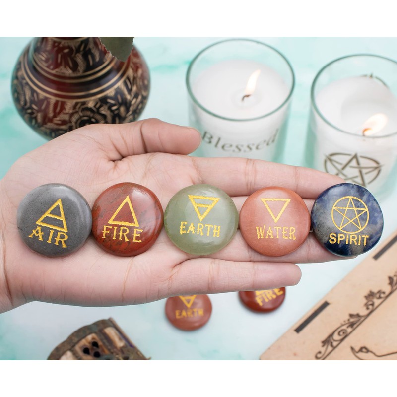 ZAICUS 5 Elements Assorted Stones Round Shape Triangle Symbols (Earth Air Fire Water Spirit) Polished Stones for Gemstone Reiki Crystals Healing