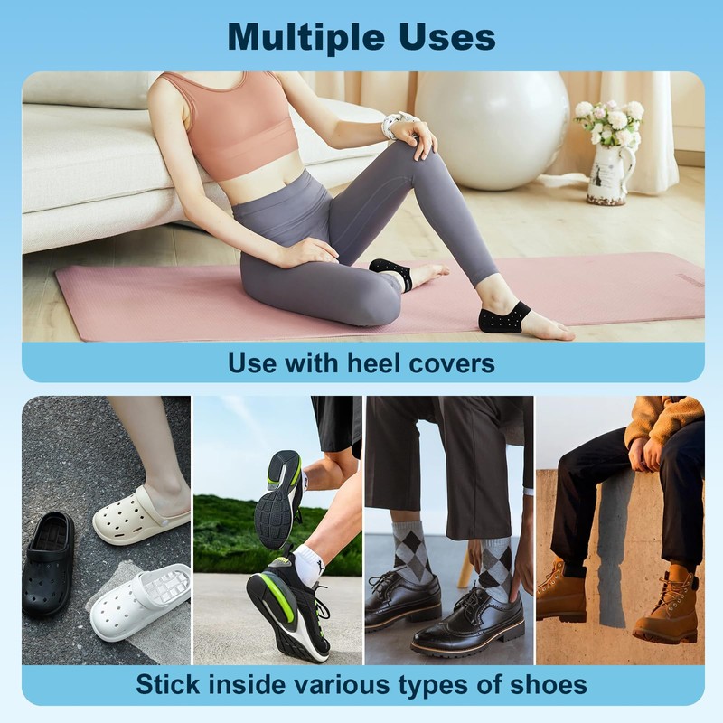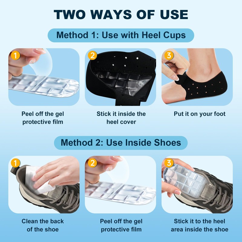 • Two Ways to Use: When you're out, you can stick the gel pad to the back of your shoe. When you're at home barefoot or wearing sandals, you can use the gel pad with the heel sleeve for continuous heel support.