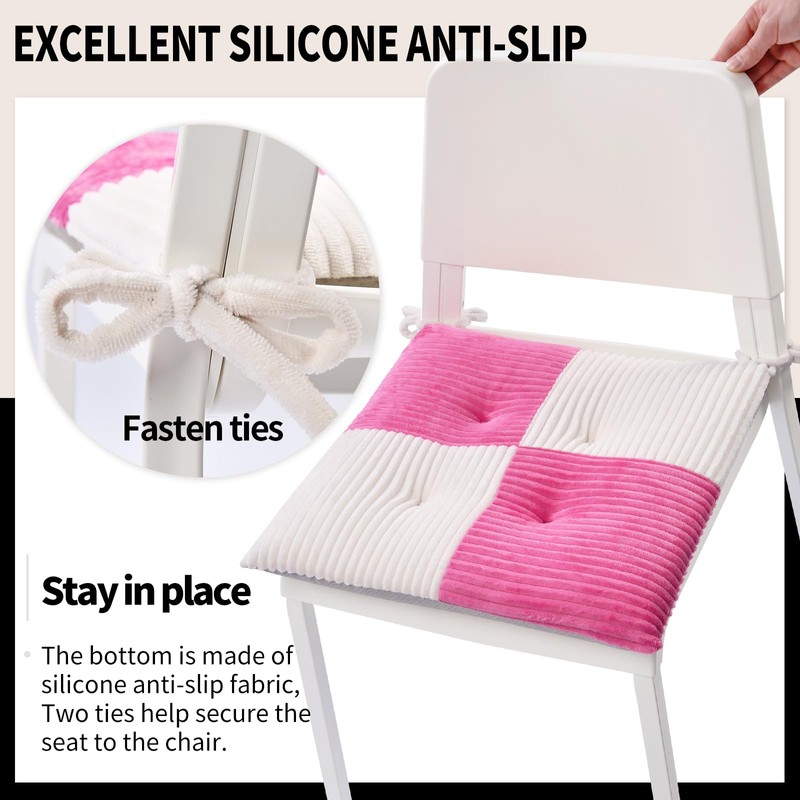 Zalvox Office Stacking Chair Cushion with Ties, Corduroy High Density Foam Non-Slip Kitchen Seat Cushion, Square 17" x 17" Indoor Dining Chair Pads, White + Pink, 1 PCS