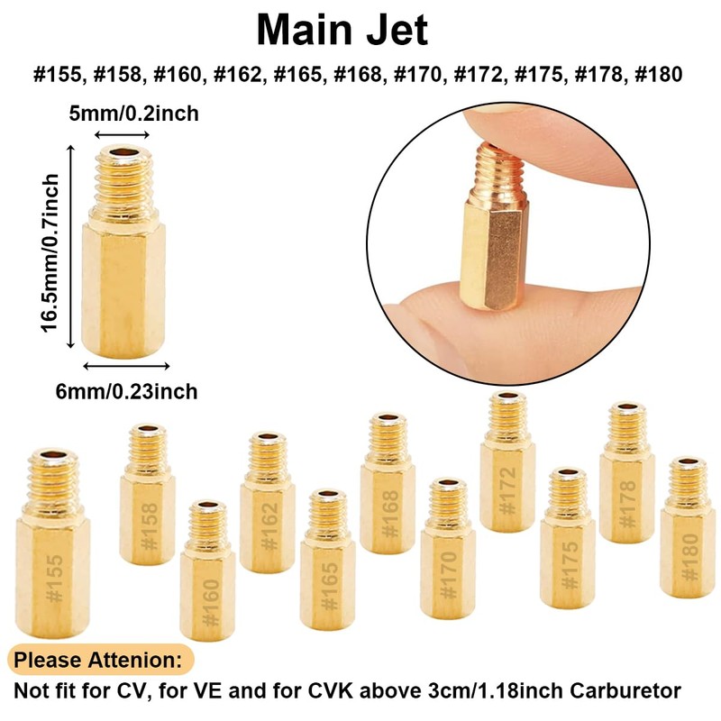 • Size of main nozzles: 155, 158, 160, 162, 165, 168, 170, 172, 175, 178, 180 (Please note: not suitable for CV, for VE and for CVK over 3cm/1.18" carburettor)