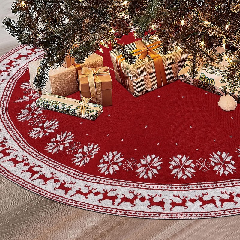 - 【Elegant Knitted Design】We use classic knitted way to design this beautiful and elegant tree skirt. The red-and-white Christmas tree mat is embellished with good-luck-symbolized snowflake and reindeer patterns around the edge, with 3 sweet bow knots at the opening, perfectly bringing a cheerful and warm festive atmosphere and matching all traditional-theme Christmas decor.