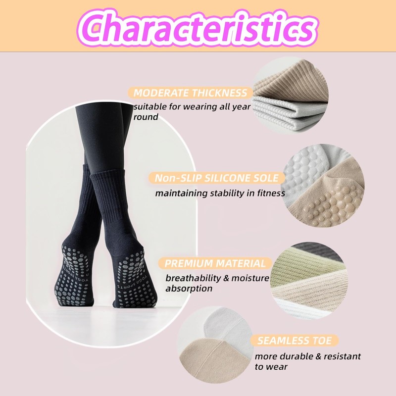 - ❤️【Non Skid Soles】 -Our yoga socks feature sticky dots on the sole, providing enhanced traction on hardwood floors, tiles, gym floors, or Pilates equipment. This design improves stability and balance, helps prevent accidents, and allows for better control over body movements. The grips are crafted from soft and elastic silicone, ensuring a secure hold for safe gripping.
