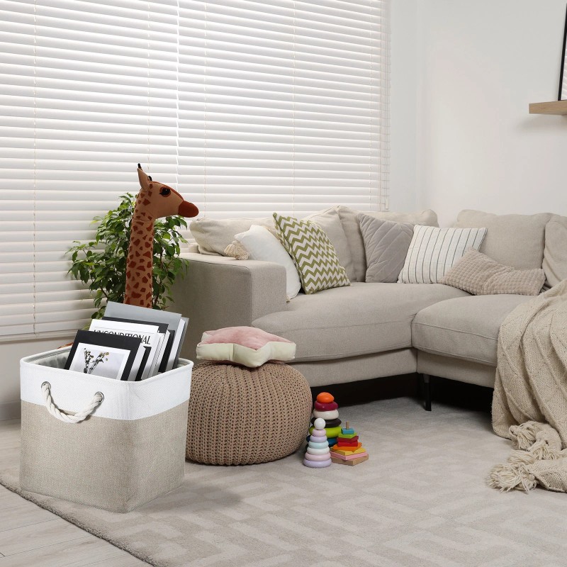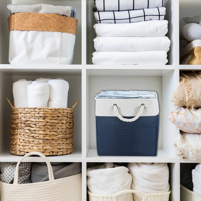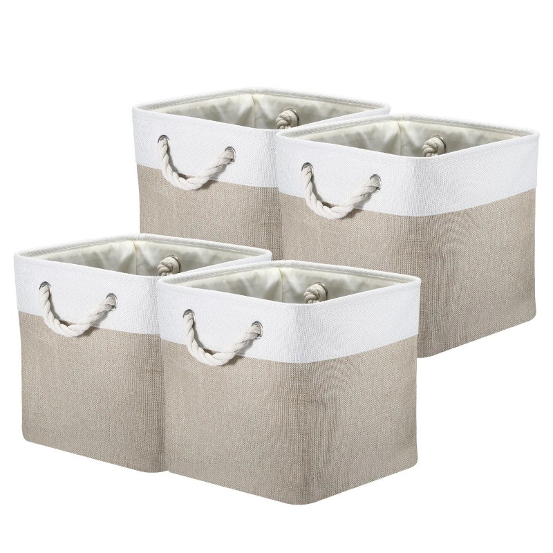 The Warm Home Storage BinCreating and decorating your home can sometimes feel like an task. They require a balance of beauty and function that sometimes seems impossible to strike, but these baskets will show that you can create a great space. This basket is a great way to hide items in your entryway or closet, It keeps the space looking clean and organized.Perfect Size For StorageThe storage baskets come in 4 packs, each measure 11", perfect for gifts baskets, and nursery organizers. These shelf baskets allow the storage of a variety of items.Lined With A Soft FabricLined with a thin muslin fabric, easy to clean, just wipe it with a damp sponge or cloth. The sturdy metal rod frame around the top keeps the basket Shape. A durable structure can allow you to put more heavy stuff. Cotton rope handles for easy slide-in and pull-out of shelves or closets. They are attached with metal grommets to the basket and the handles themselves are made from soft cotton rope.Fabric Storage Bin With Portable DesignThese shelf baskets can simply fold into flats for space-saving when not in use or to transport.Great Storage Basket For Shelf And ClosetThese Baskets are perfect for storage Blankets, Towels, DVD, Books, Magazines, Gifts, and Socks. Storage Bins work great for organizing closets, Living Rooms, Bedrooms, rooms, bathrooms, Nursery Rooms, and Apartments
