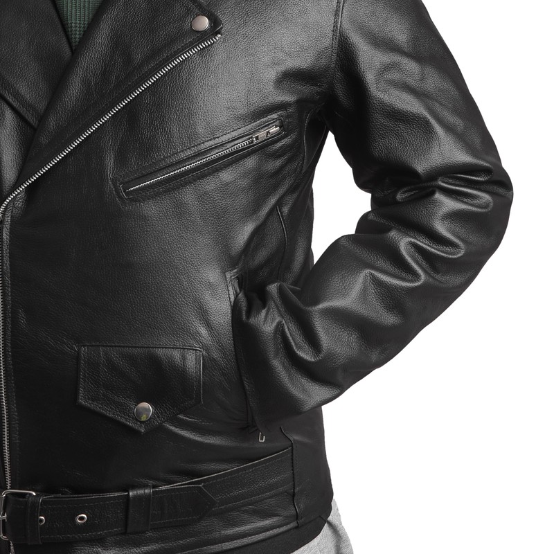 An adjustable belt on a leather Motorcycle Jacket provides a secure fit and helps to prevent air from entering, making rides more comfortable.