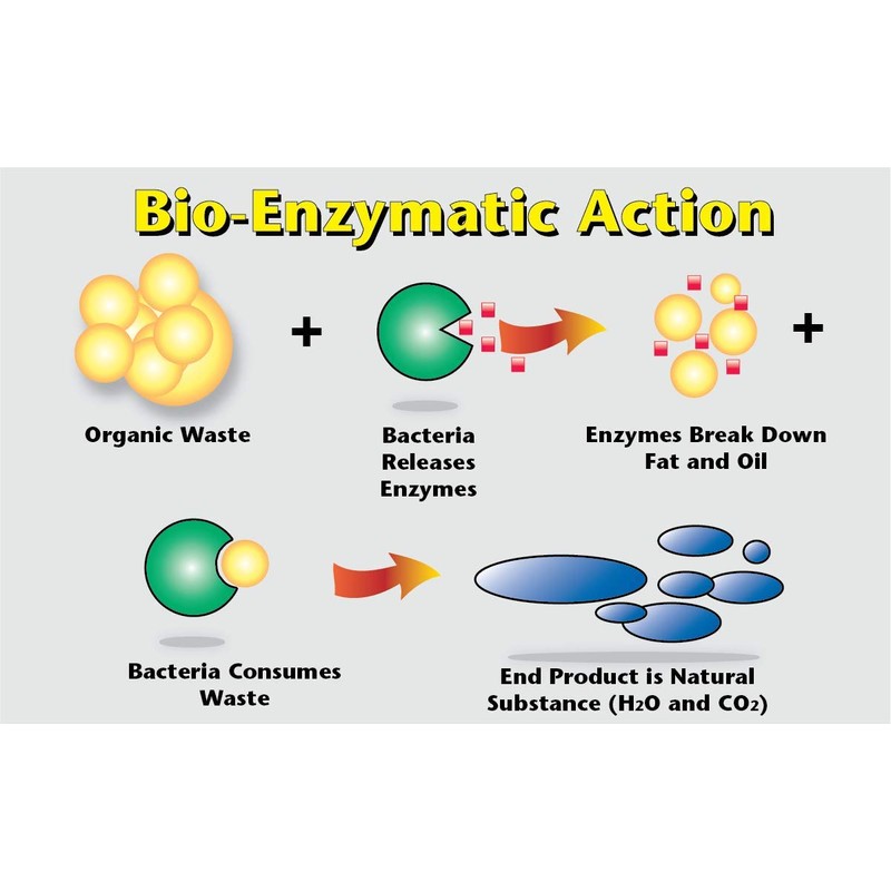 Upon contact with residues of urine, feces, vomit, blood, food soils and other organic wastes enzymes begin breaking down the odor-forming organics into liquids. The bacteria then convert the absorbed organics into carbon dioxide and water which quickly dissipate.