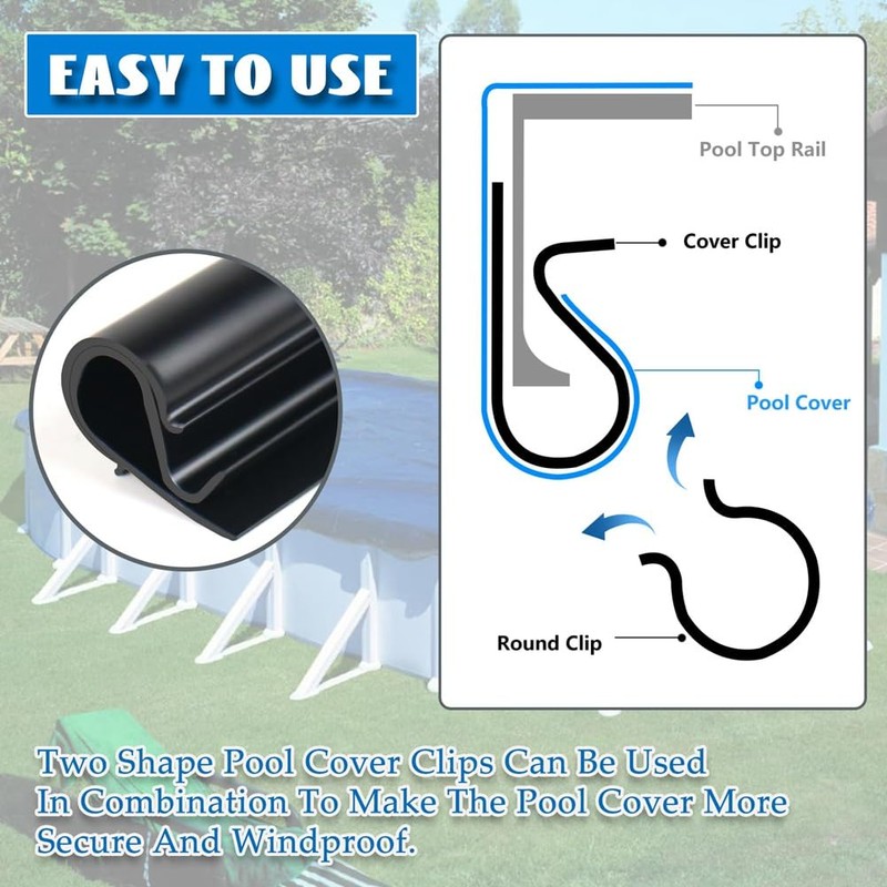 - Above ground winter pool cover clips protect your pool cover from strong winds and other harsh weather during the winter, and the combination of two shapes of pool winter cover clips keeps your pool cover securely attached to your pool all winter long. Installation details: You can put the male clip on the pool rail, then cover the pool cover, and finally put the female clip on the pool cover and male clip to achieve a solid effect.