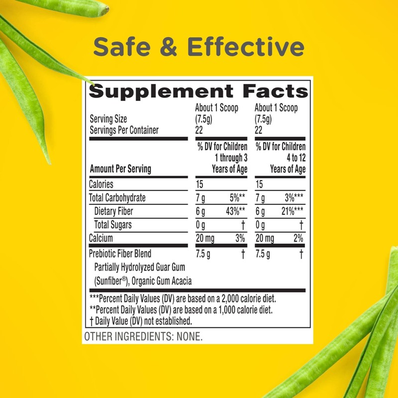 - The safe and effective fiber powder for kids is gentle for daily use and happier tummies*. The kids digestive support* supplement is an excellent source of fiber containing 6 grams of fiber per serving; that's as much as one cup of cooked broccoli