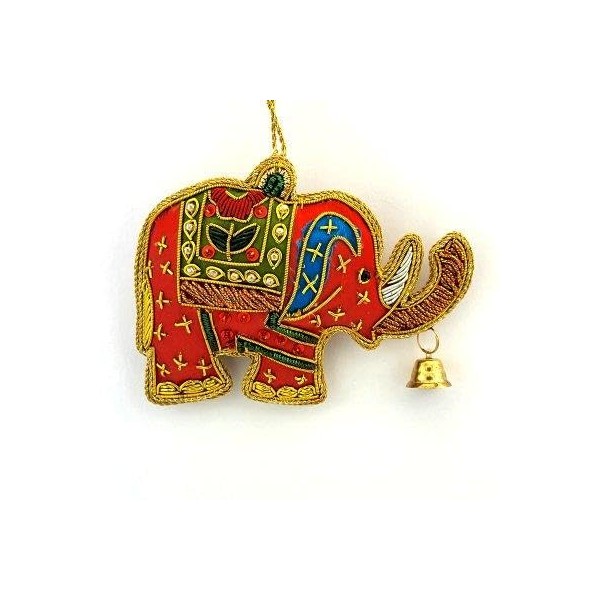 Zardozi - Embroidered Christmas Ornament - Red Elephant with Bell