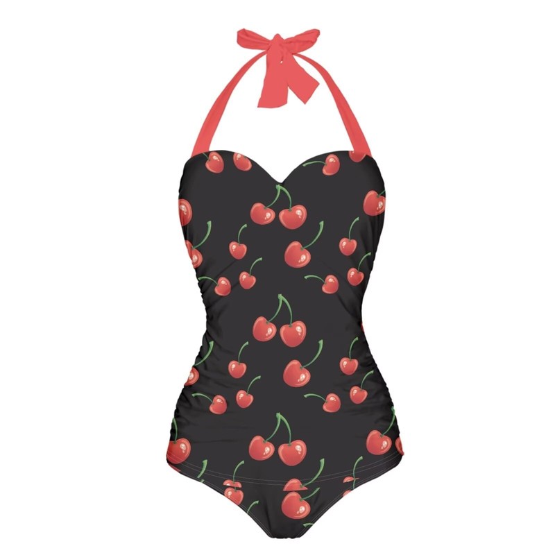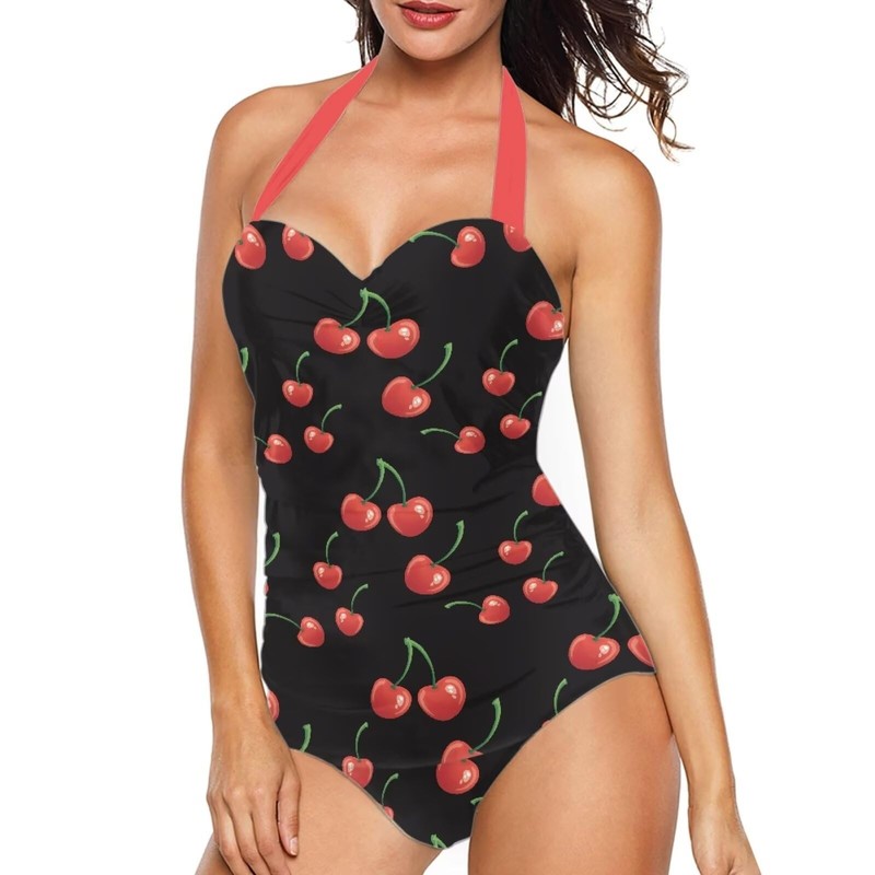 Zarisguat Fruits Cherry Print Women One Piece Swimsuits Tummy Control Halter Bathing Suit Adjustable Halter Strap Swimwear for Summer Beach Travel 2XL