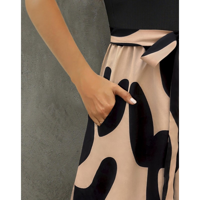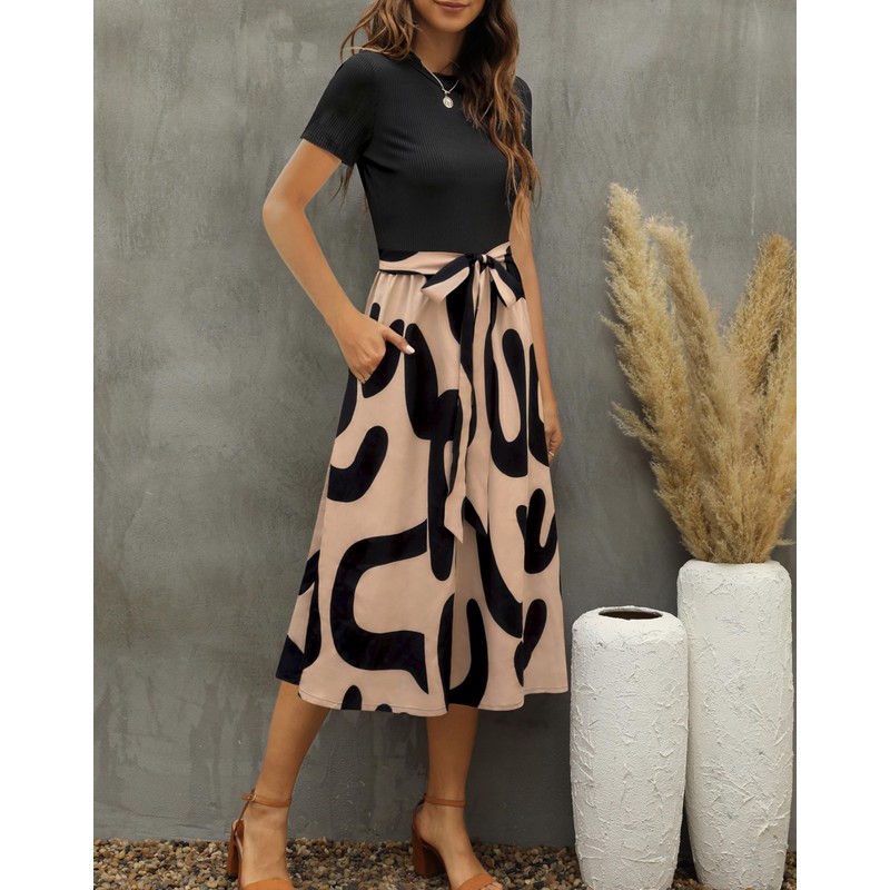 - Features: Round neck, short sleeve, ribbed bodice material top, belt tie waist, two sides pockets