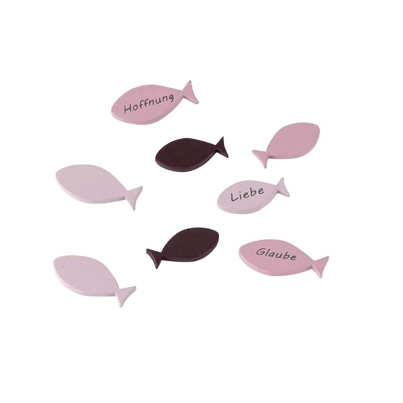 - 5 m table runner fleece in pink, 500 g granules in white and 8 wooden fish in berry tones as a scatter decoration, 3 pillar candles in white/pink/berry table decoration