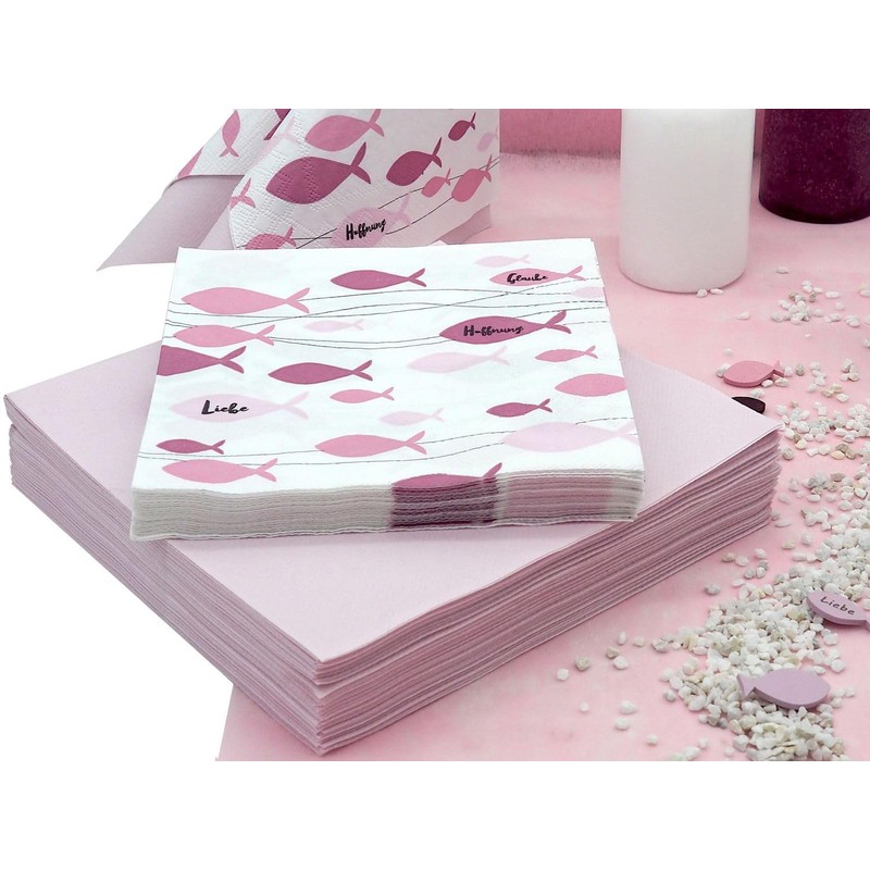 - Pack of 20 napkins with motif 'fish faith, love, hope' (33 x 33 cm) and 20 napkins plain in pink (40 x 40 cm)