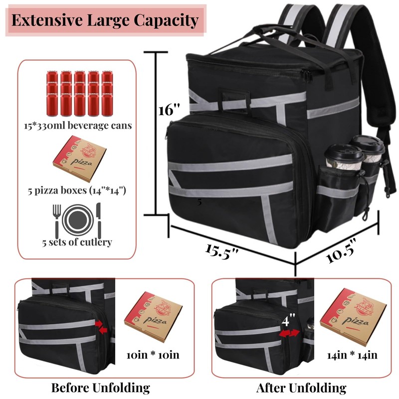 - Expandable Large Capacity: Unextended dimension: 15.5''L x 10.5''W x 16''H, expanded dimension: 15.5''L x 14.5''W x 16''H. An expandable zipper brings an additional 4 inch on the bottom layer, providing extra capacity. Easily stack 5 pieces 12 inch pizza boxes. Designed with 4 side cup holders with flexible straps for a secure hold on drinks, sure to meet your safe delivery needs