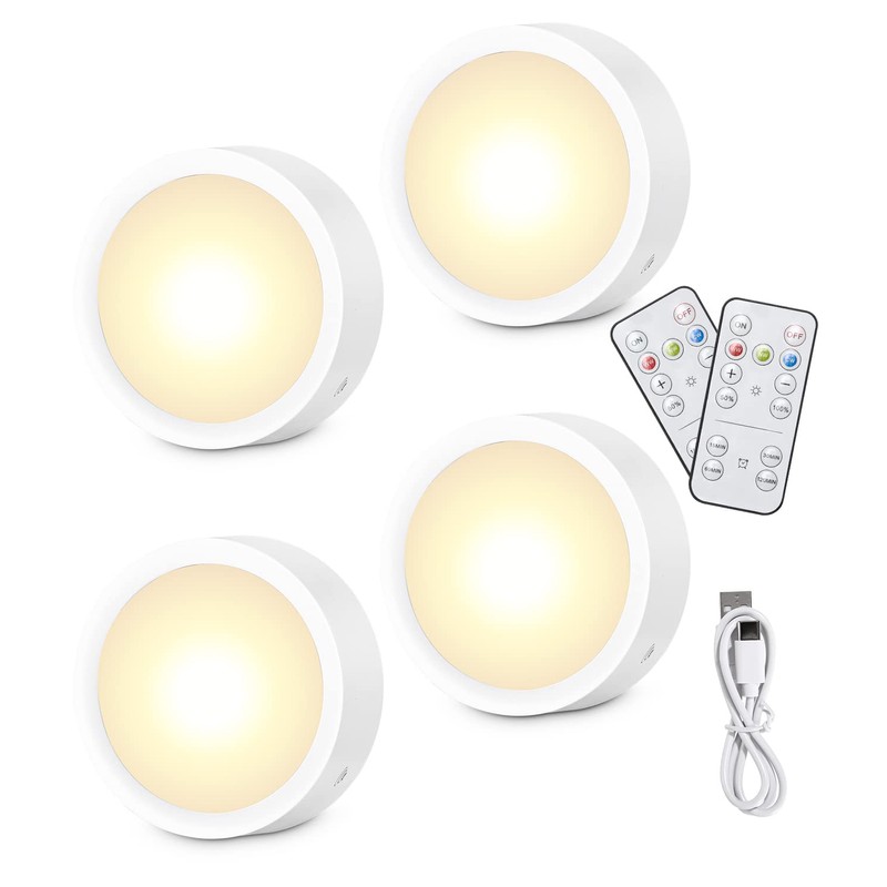 - Rechargeable and energy-saving: round LED under-unit light with an integrated 1000 mAh lithium and offer impressive 15 hours of continuous lighting on a single charge. Use the convenience of wireless charging with the included USB-C cables and enjoy the fact. With the additional advantage of two remote controls, these adjustable, dimmable LED spotlights improve your visual clarity and create the perfect ambience.