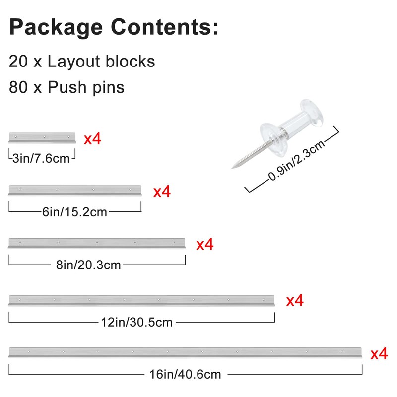 - Package Contents: 4 x 16" Thickened aluminum alloy blocks, 4 x 12" Thickened aluminum alloy blocks, 4 x 8" Thickened aluminum alloy blocks, 4 x 6" Thickened aluminum alloy blocks, 4 x 3" Thickened aluminum alloy blocks, 80 x Push pins.