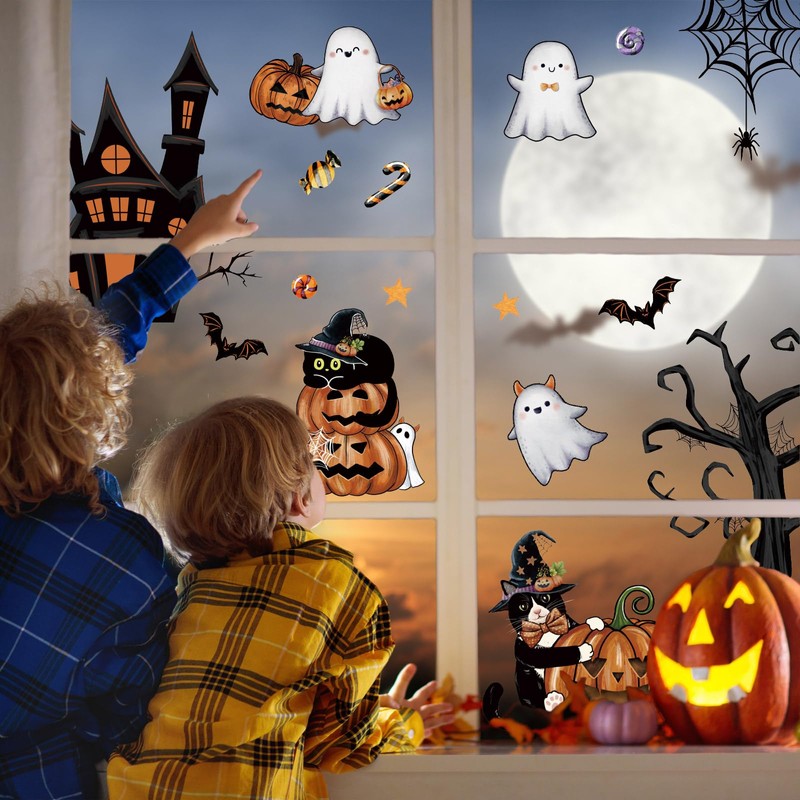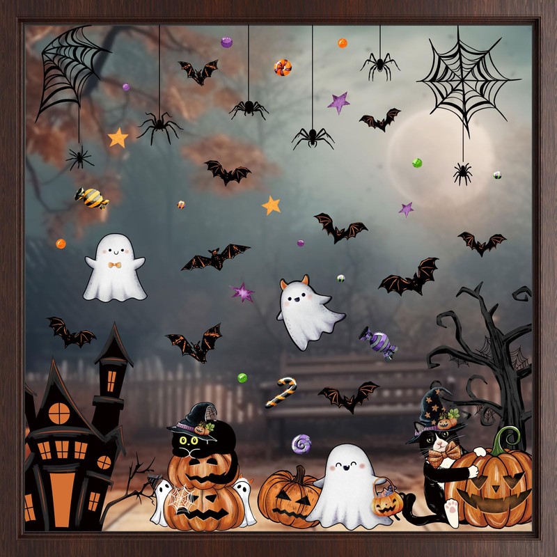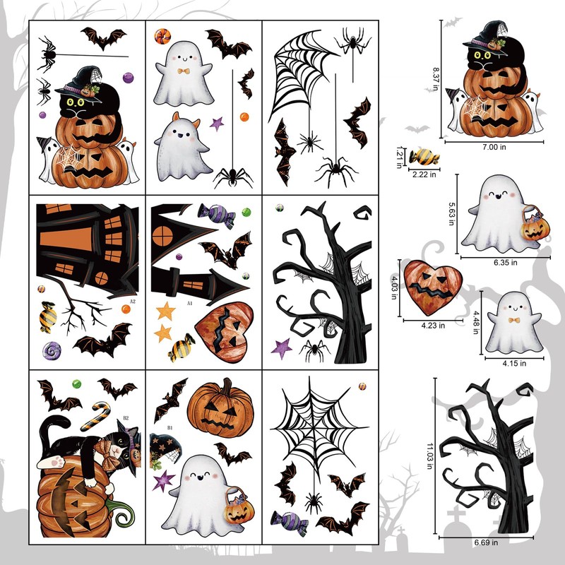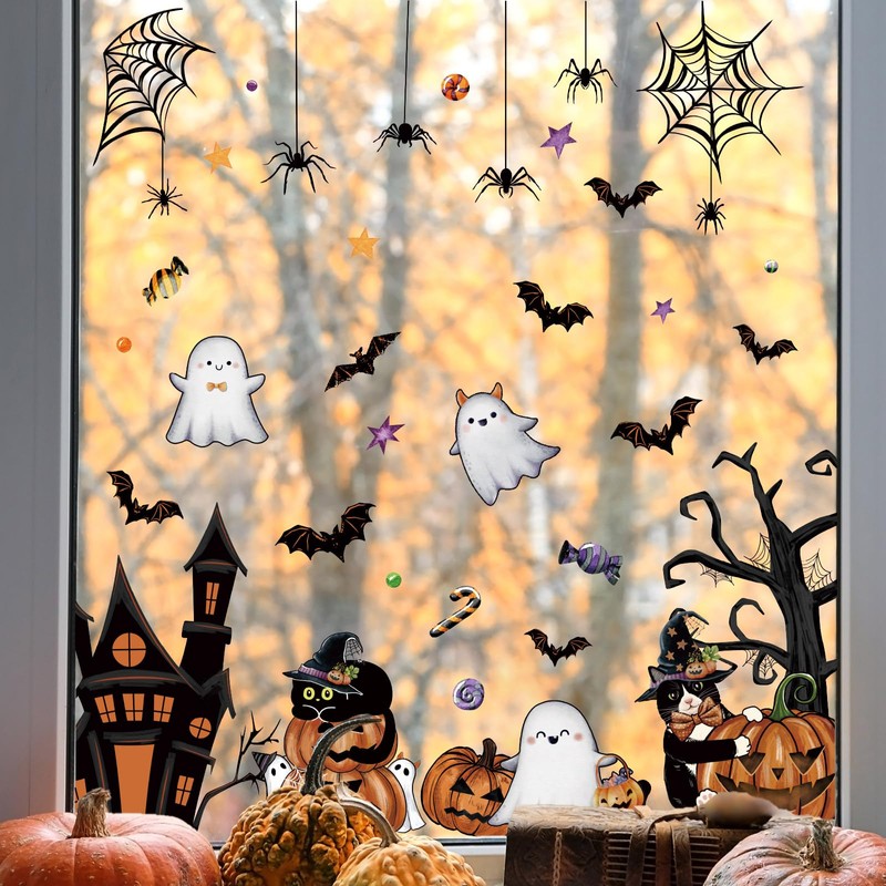 ZAWE 9 Sheets Halloween Window Clings Castle Ghosts Bats Evil Pumpkins Cats Reusable Double-Sided Window Decals Stickers for Fall Party Home Classroom Office Decorations
