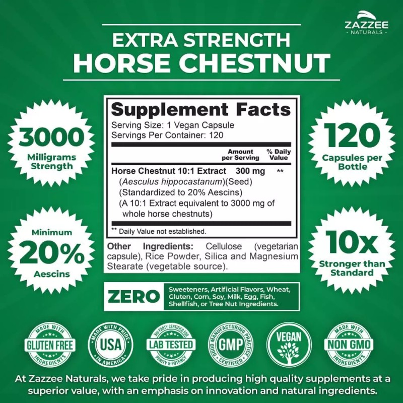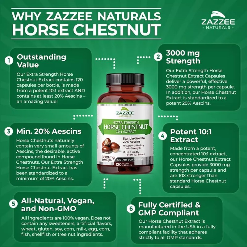 Some of the many benefits of Zazzee Naturals Extra Strength Horse Chestnut Extract include: