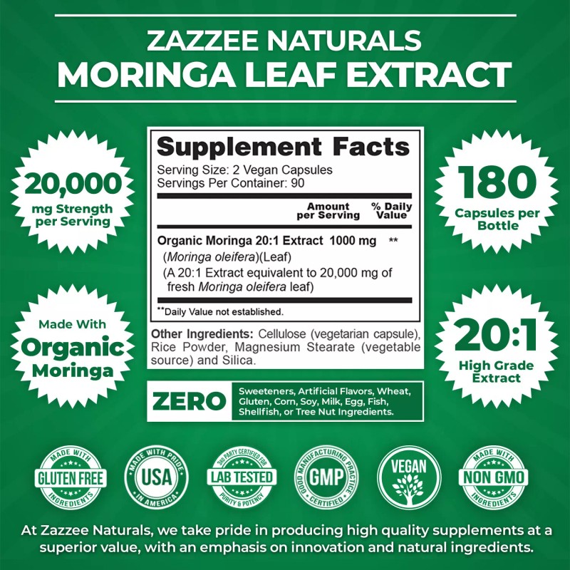 Zazzee Organic Moringa 20:1 Extract, 20,000 mg Strength, 180 Capsules, 100% Pure