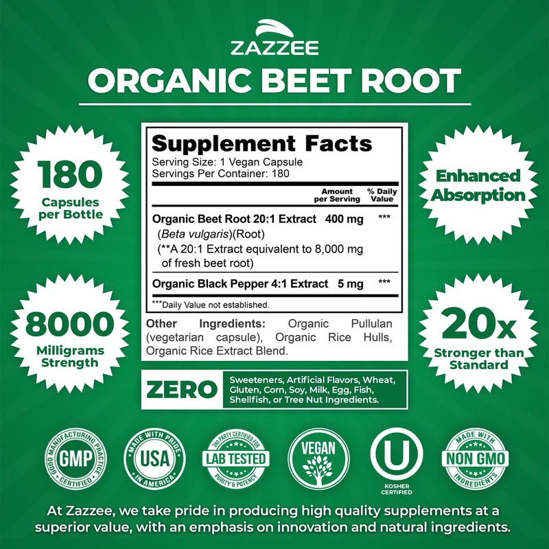 - USDA CERTIFIED ORGANIC: Any Beet Root that is not CERTIFIED organic can be highly contaminated and even toxic to your body. With Zazzee Naturals Certified Organic Beet Root Extrct, you can be sure your Beet Root is organic, all-natural, vegan, and non-GMO. More, while other competing products use various chemicals as fillers, binders, and excipients, our Organic Beet Root Extract contains only all-natural, organic stabilizers.