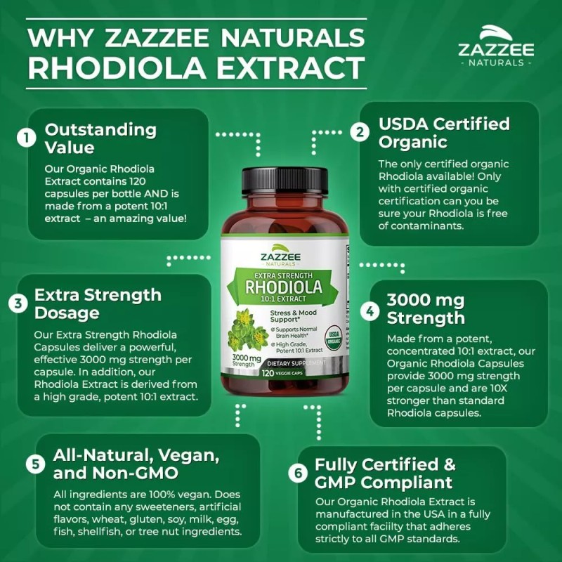 Zazzee Naturals Certified Organic Rhodiola Extract provides 3000 mg strength per capsule and contains 120 capsules per bottle -- the best value available!
