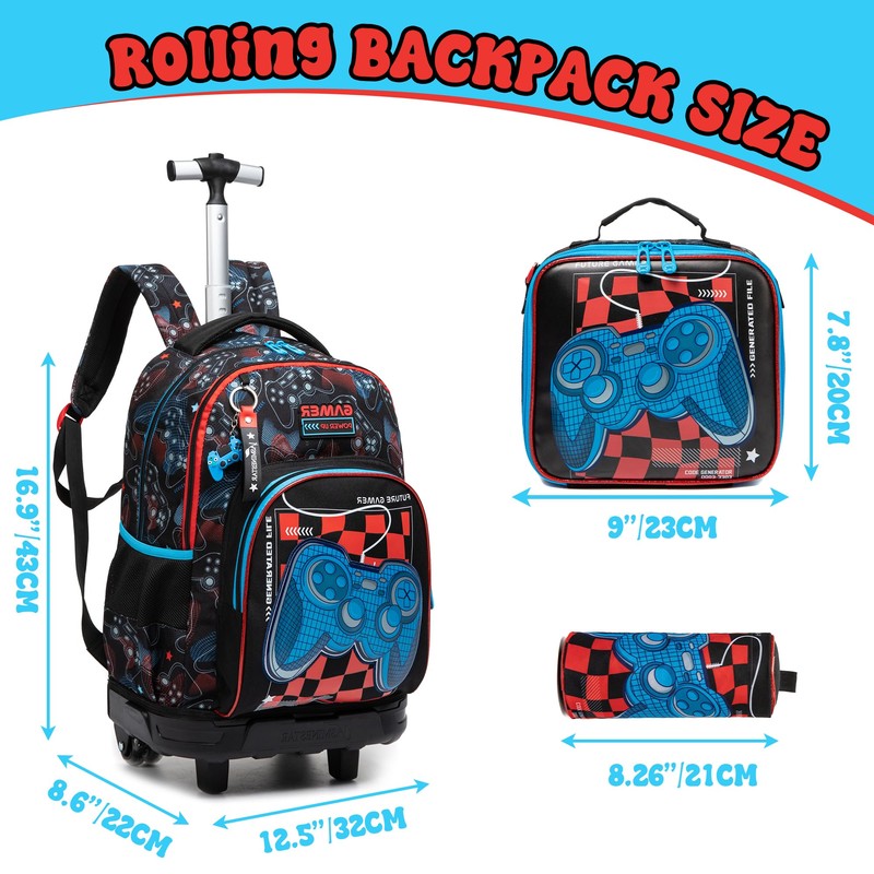 - Rolling Backpack For Kids 8-12 Size:backpack:16.9*12.5*8.6in/pencil case:8.26in/lunch box:9*8.2in