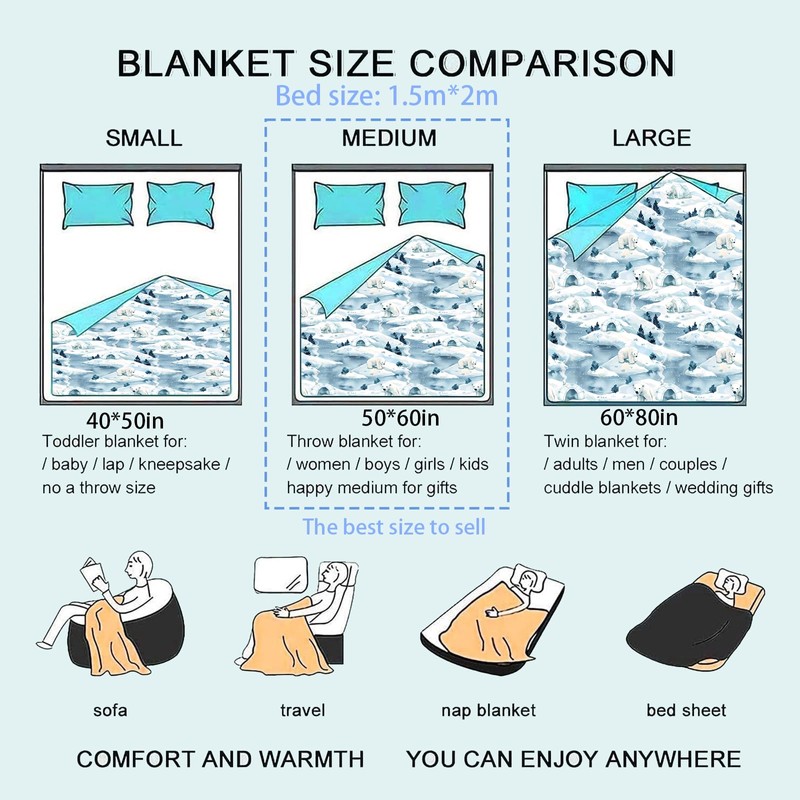- 【Size】The Blanket measures 3 sizes: 50x40 inches,60x50 inches,80x60 inches.For the blanket of 50x40 inches and 60x50 inches,it's so light and easy to carry.You can take it to anywhere even if you need take different vehicles such as the car,plane,ship,train or any others.The 80x60 inches one is good for double and full beds.You can trust these blankets are your good choice,whether in your room,your cars or on your camping business trip.