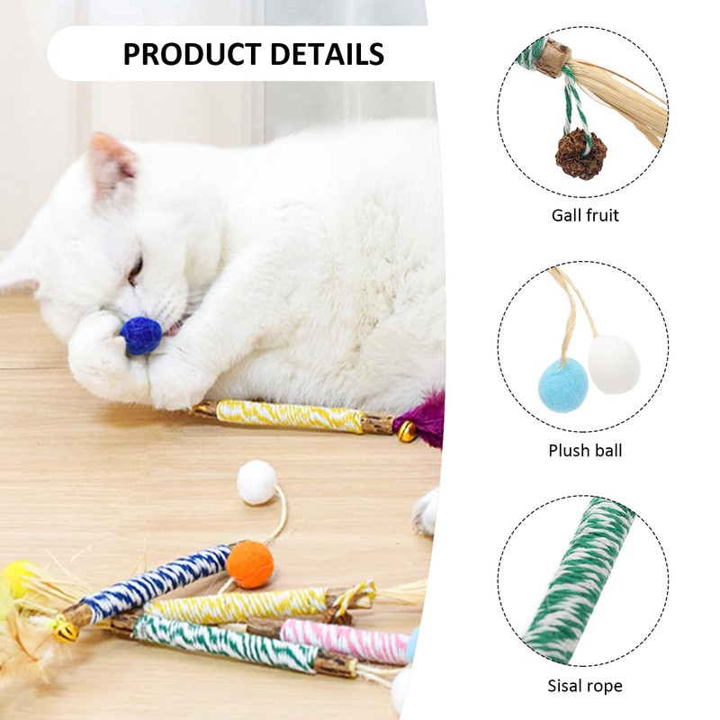 This kitten toy set consists of a total of 8 pieces, including 4 colourful rope models for insect gall fruits and 4 colourful rope spring models. They are all made of polygonum and are about 25 cm long. Each toy is colourful and very suitable for attracting cats. Interest. These toys not only help cats grind their teeth while playing and maintain oral health, but also help them relieve stress by chewing and avoid furniture scratches. The colourful rope design makes it easier to hold and carry the toy and makes it easier for the owner to participate in the cat game, which increases interactive fun. It is an essential entertainment device for any cat family.