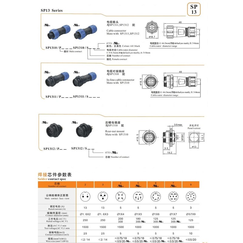 - Weipu SP13 is a popular outdoor range. It is made of plastic with threaded coupling, its outdoor waterproof IP rating of IP68 plug makes it excellent among other products. With a small hole size of 13mm, it is available for various options from 2 to 9 pins.