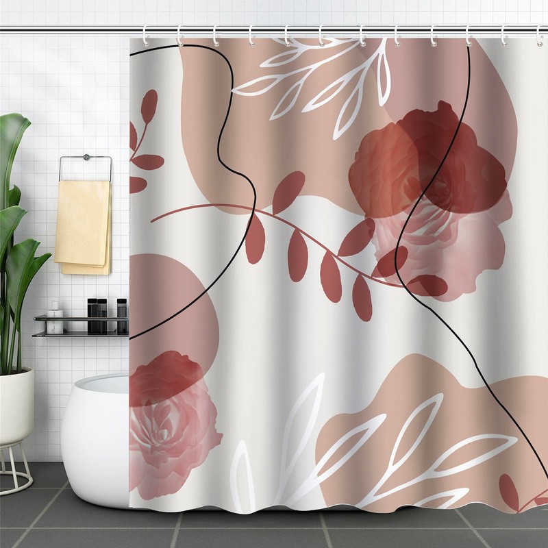 ZCHOMI Abstract Boho Pink Brown Shower Curtain Mid Century Modern Minimalistic Leaves Aesthetic Shower Curtain for Bathroom Waterproof Polyester Fabric Bathroom Curtain 72 x 72 Inch with 12 Hooks