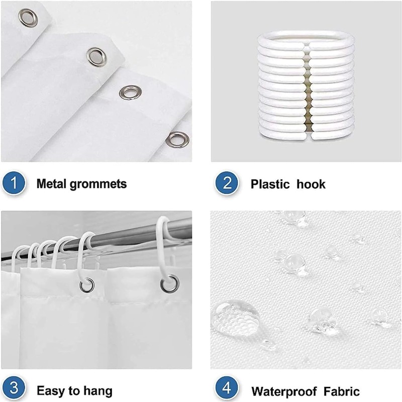Easy to Install: Each shower curtain set comes with 12 plastic hooks for attaching the grommets to the shower rod.
