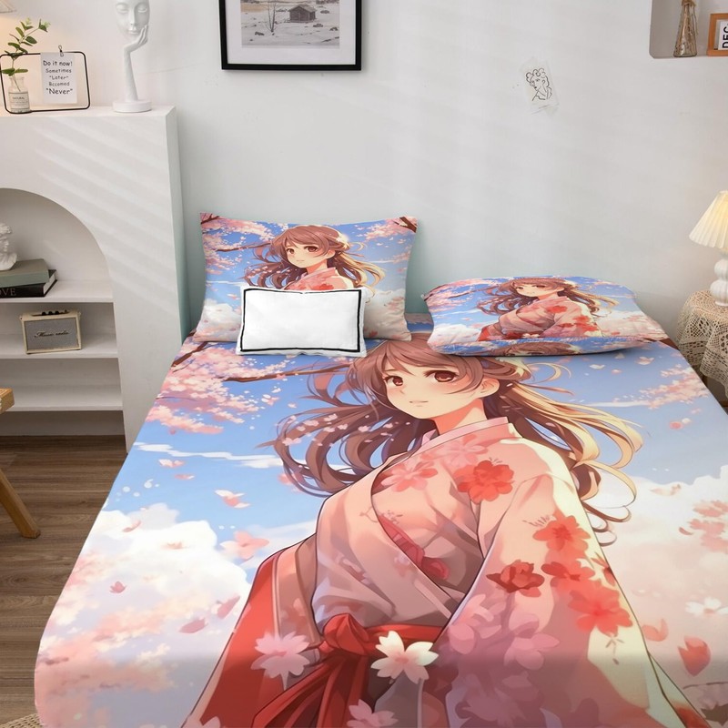 zcsm Anime Girl Sheets Full Size - Japanese Bed Sheets, Soft Microfiber & Deep Pocket & Wrinkle Free Patterned Bedding Sheets & Pillowcases, 4 Piece (1 Fitted Sheet, 1 Flat Sheet, 2 Pillow Cases)