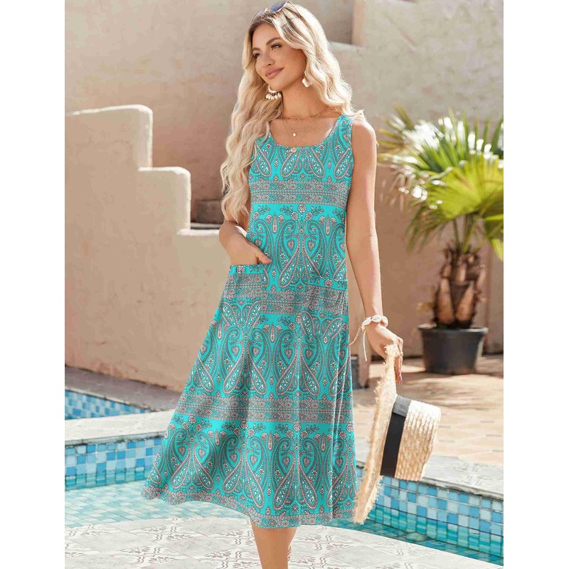 - 【Features】Women summer dresses feature crewneck, sleeveless, tank dresses, A-Line dresses, high waist, calf length, casual midi dresses, summer beach dresses with two front pockets, comfy and stretchy long dresses for women.